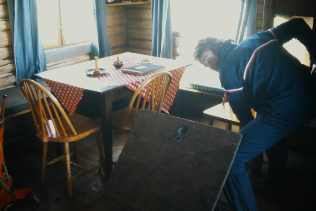 Djupslia var den koseligste hytta. Gammel tømmerkoie med sittebenk rundt vinduene i kroken, ovn i det ene hjørnet og to senger i det andre pluss kjøkkenbenk langs veggen ved døra.