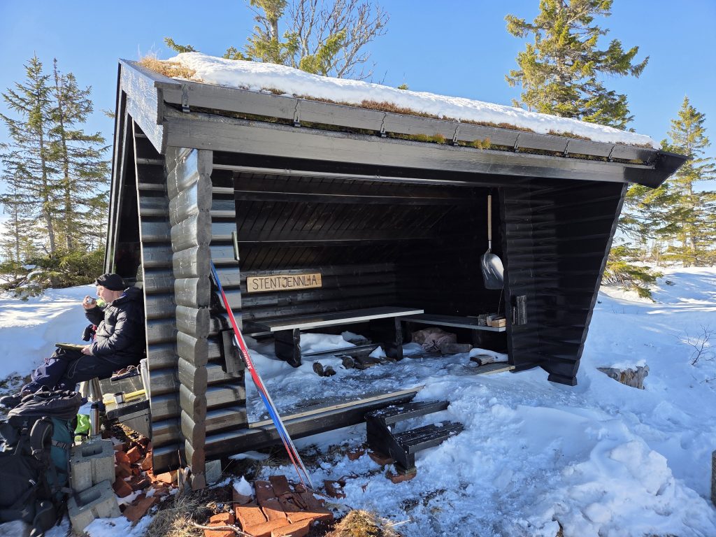 Gapahuken på åsen syd for Stentjenna. Ved Stentjenna står det en tømret bu, som visstnok er åpen