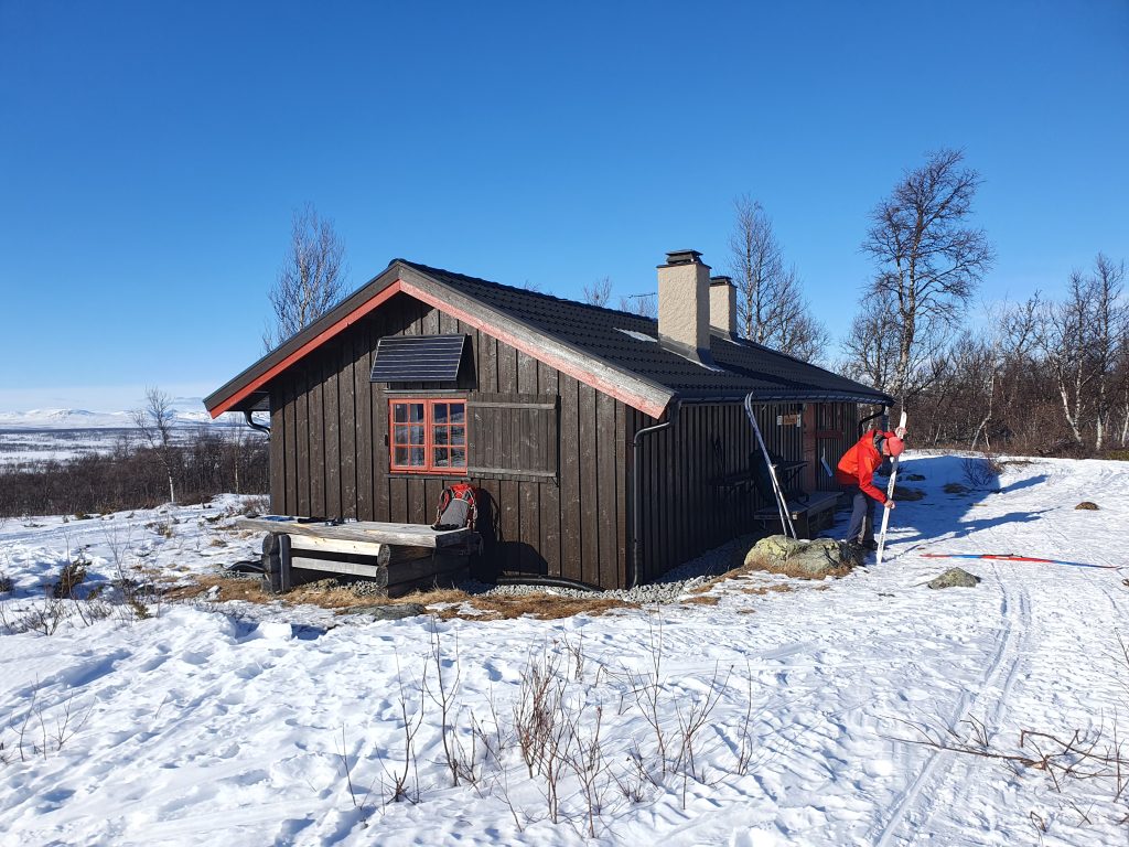 Fra demningen var vi heldige og kom inn på et scooterspor som førte oss helt til DNT-hytta Skriurusten, der vi hadde en sen lunsj inne i koselige hytta med fantastisk utsikt. Mange av bjørketrærne foran hytta var nylig blitt fjernet.