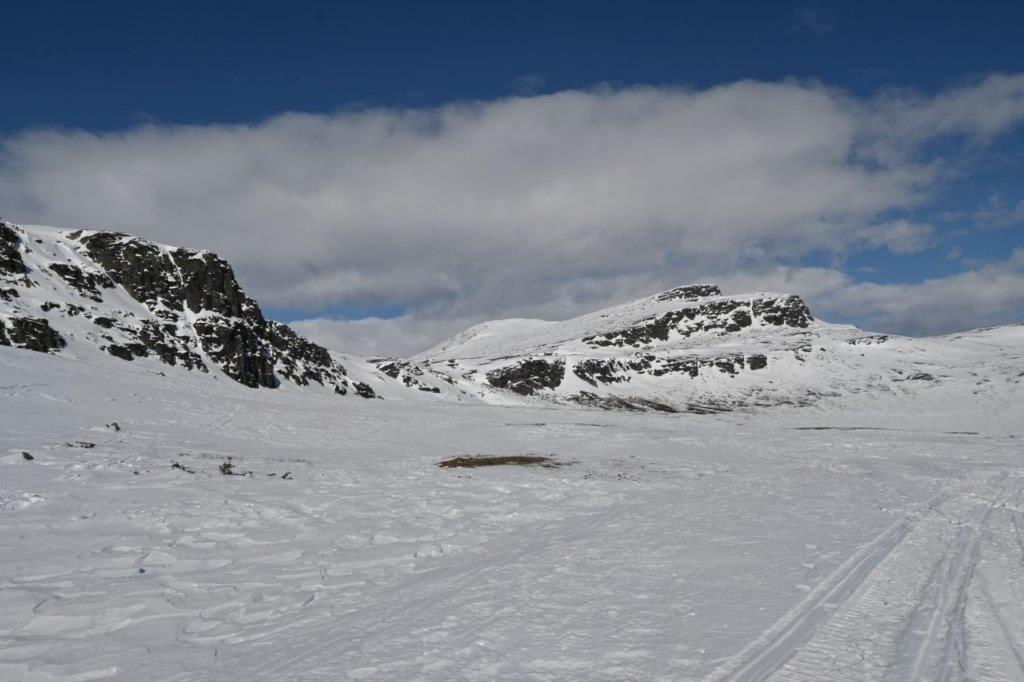 Herfra fulgte vi en rygg i østlig retning, og hadde det mektige Hindholet på høyre side. Her har det ligget en bre engang, men nå er det igjen et dypt gjuv med stupbratte vegger. Vannet Hindtjørnin (1725 moh) lå nå under is og sne.