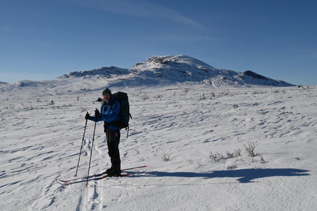 Knut hadde aldri gått Leirungsdalen helt til bunns, så det var dagens mål å se over kanten og ned i Svartdalen, der vi tidligere har vært på vei opp på Knutholstind og gått Torfinnstindtraversen. Vi koste oss på nysnøen innover, rundet Raudhamran på nordsiden og hadde en lunsjstopp med utsikt mot store og ærverdige Munken. Vi fulgte dalen innover og slakt oppover med sola etterhvert i ansiktet fra en knallblå himmel og vindstille. En helt praktfull dag!
